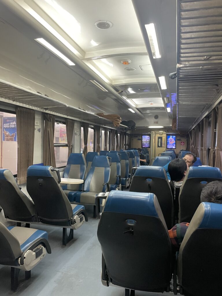 早めにハノイ駅に到着し、窓口でチケットを購入します。定刻通り電車が到着し座席に座ります。朝一ということもあって席はガラガラ約2時間半どのかな街並みを見ながら時間を潰します。