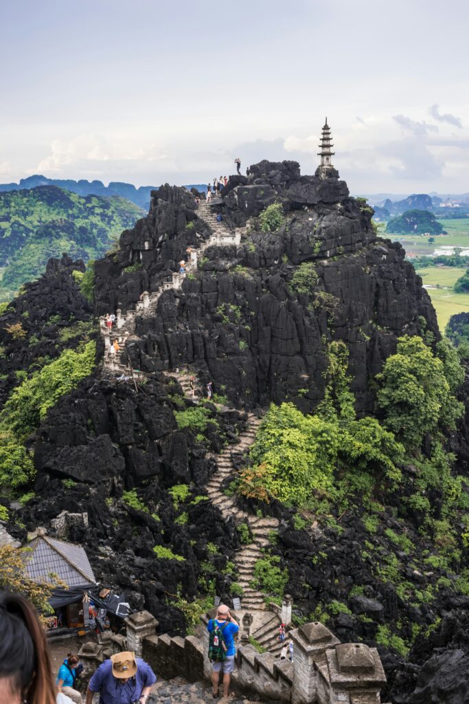 山頂まで約500段の階段を登ると…そこにはニンビンを一望できる絶景があります。有名ポイントは山頂のドラゴン像の展望台 観光客がドラコンの尻尾から頭にかけてびっしり!足元がとても不安定でドラゴンの胴体はとても細いので注意が必要です!バイディン寺→チャンアン→ムア洞窟の順番で回ればムア洞窟の頂上から夕陽が見えるかも?!