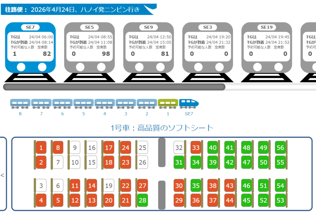 主要停車駅はハノイ、ニンビン、タインホア、ヴィン、ドンホイ、ドンハ、フエ、ダナン、クイニョン、ニャチャン、ファンティエット、サイゴン(ホーチミン)などです。